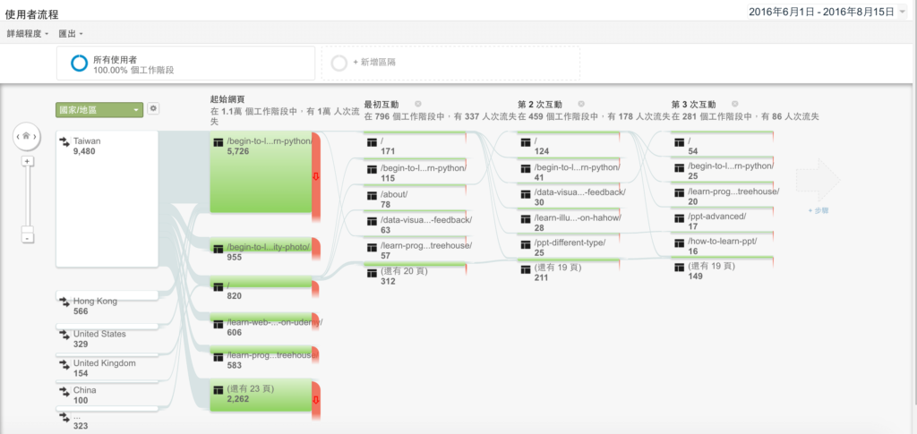 這張圖的順序是由左至右,以視覺化的方式呈現。以我部落格為例,可以看到灰色的大水管直接灌到最上面的 Python 學習心得,留言也都集中在這篇,單篇三萬瀏覽量我覺得好感人。